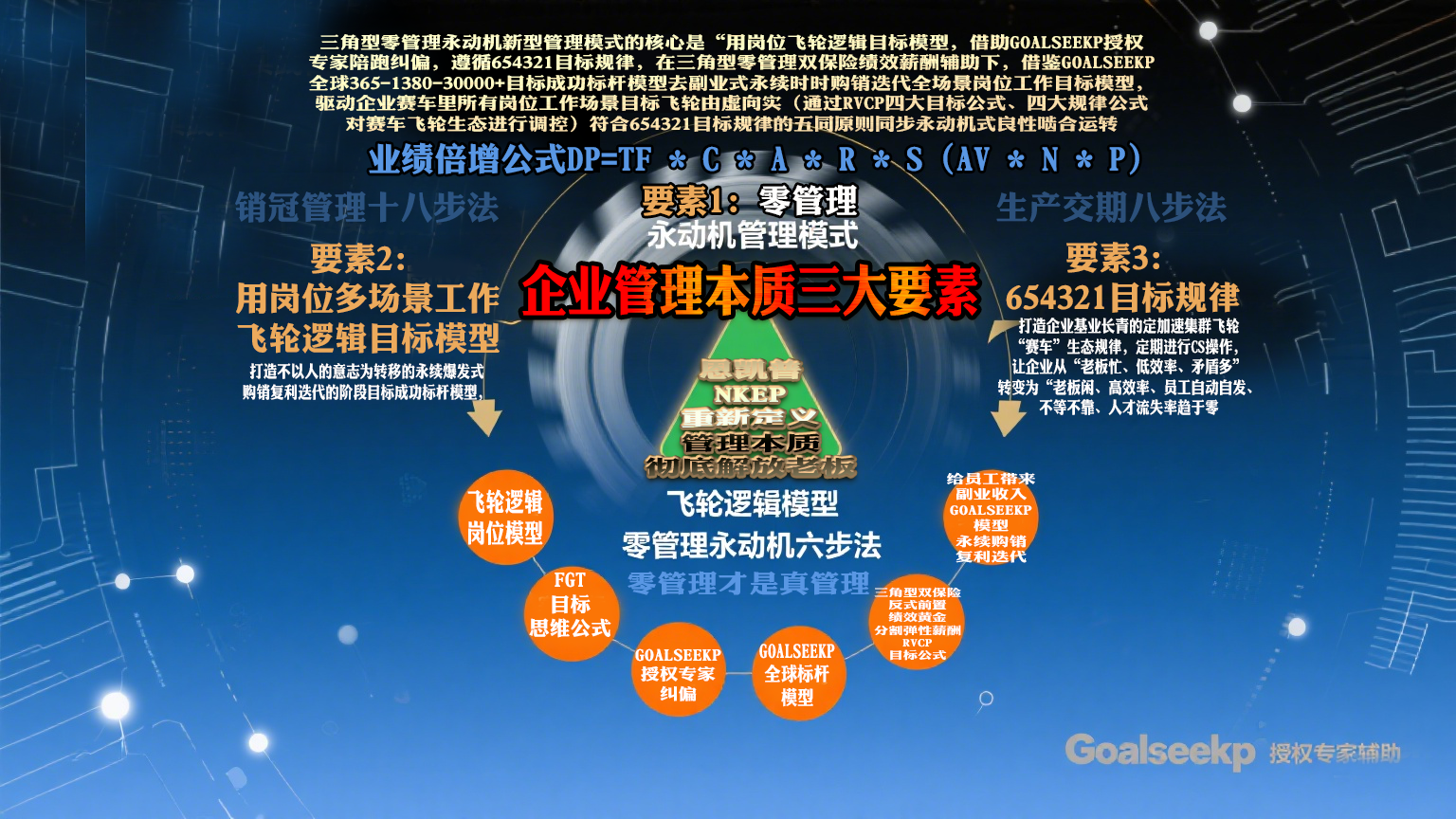 企业管理的本质,不是通过人、事、流程、规则的组合,不是靠自上而下战略目标设定而SMART拆解出来的,更不是靠理想化各类绩效指标线性堆砌出来的,不是靠个人色彩严重上级一言堂领导的指令驱动,更不是靠负责人管控的绩效评估考核出来的,而是贯飞轮逻辑FGT目标思维公式。在Goalseekp授权专家辅助下,搭建亿级架构与模型价值链;靠岗位实践目标模型三角型零管理永动机六步法永续迭代,通过永动机管理模式、飞轮逻辑模型、654321目标规律三位一体构建管理赛车动态迭代飞轮生态体系,打造一套无需管理的、可时时迭代、副业购销的岗位工作价值实现的动态飞轮模型。(注意,千万不要靠软件固化)。按规律办事,才能事半功倍。以下通过七个方面来具体说明: