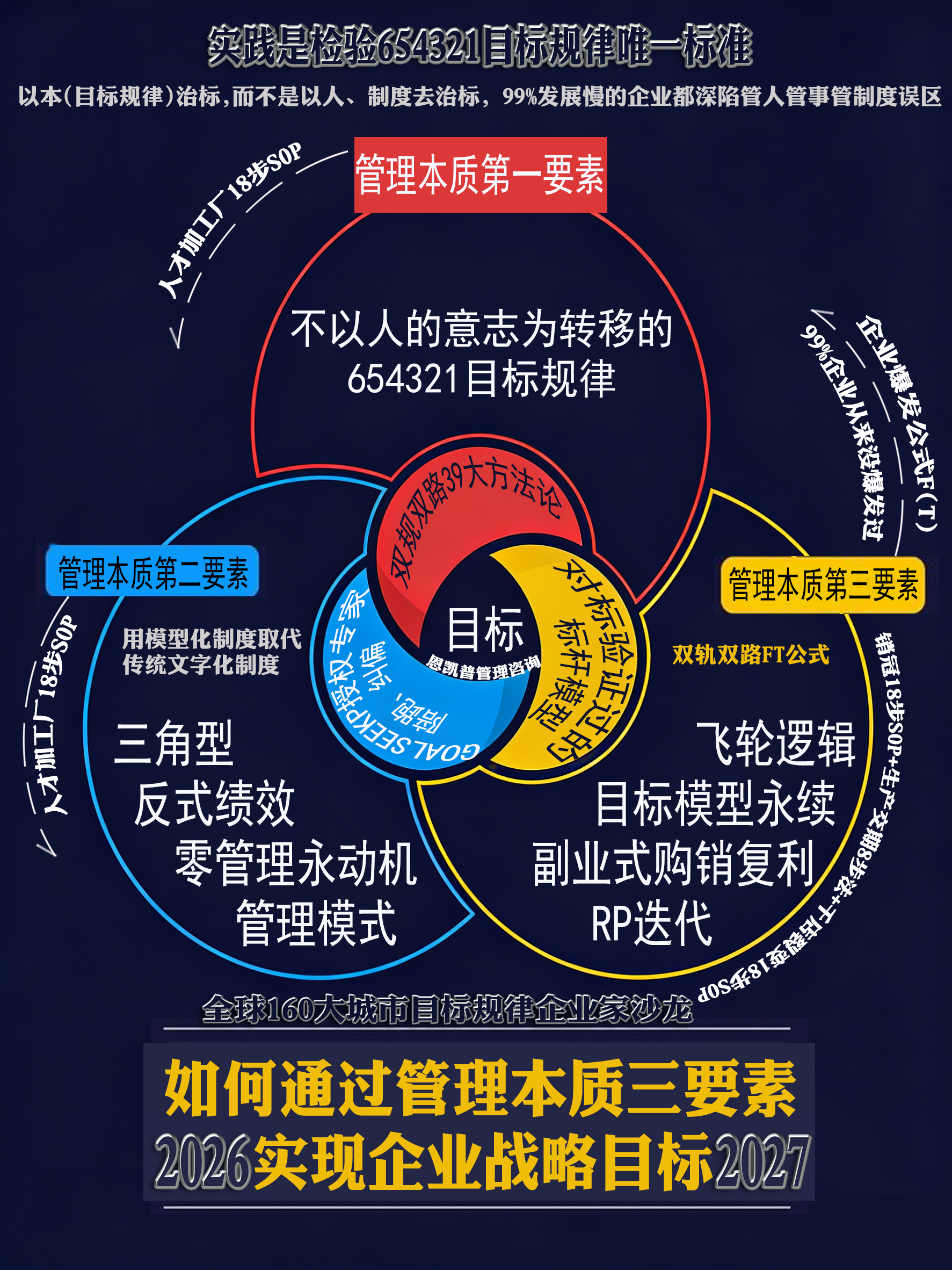 抓本放标、以本治标、3+4战略价值链指引、三角型双保险反式绩效五同原则极简管理、飞轮逻辑FGT铸魂、爆发公式引领、规律制胜、得654321目标规律者得天下: