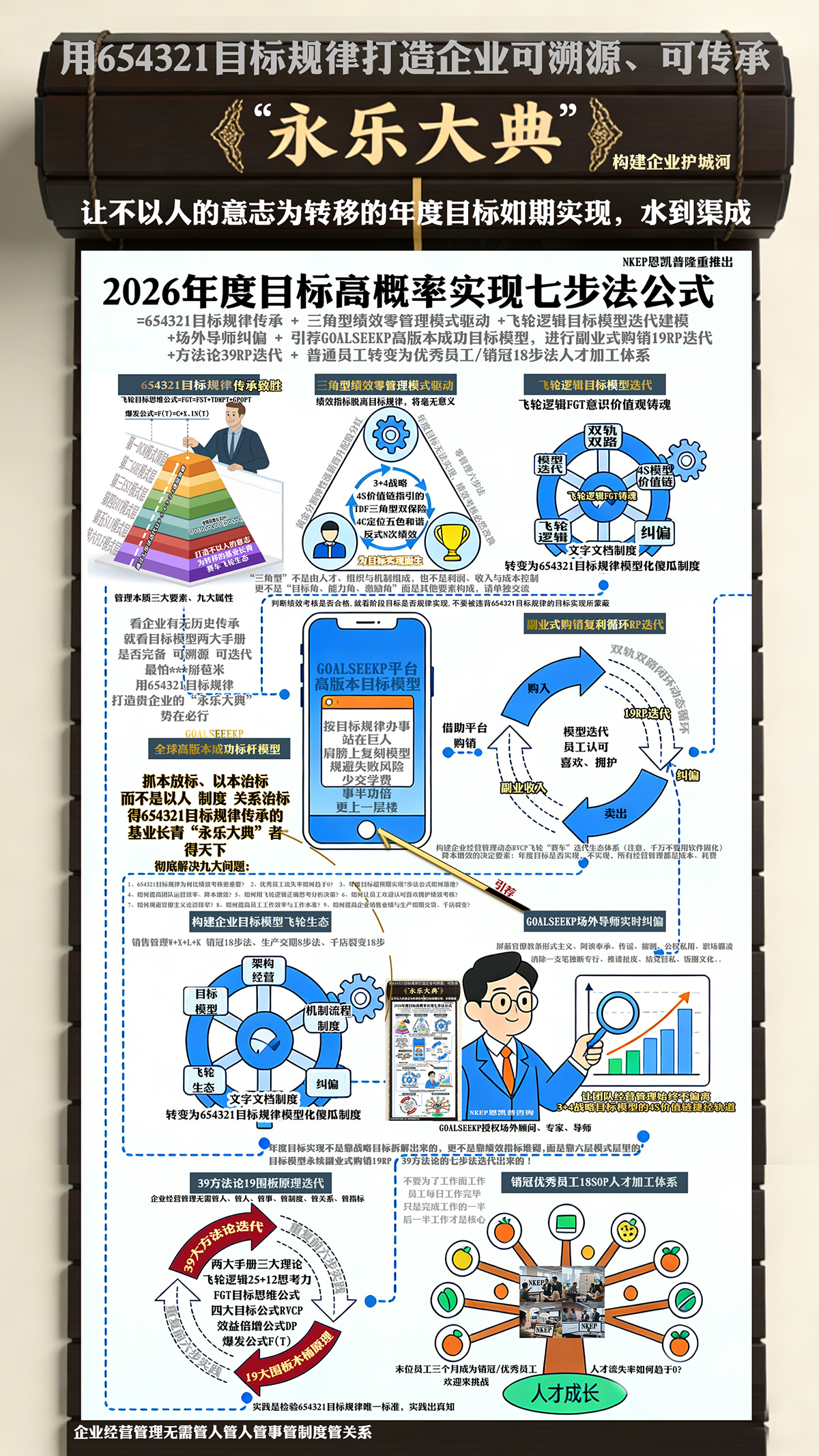 恩凯普重新定义企业管理本质三大要素——抓本放标、以本治标、654321目标规律【聚焦管理本质三大要素、九大属性,嵌入发展爆发公式f(t)=c+xIN(t), 在Goalseekp授权场外专家导师辅助纠偏下,驱动6大目标模式层逐层级实现突破的可传承商业登顶规律】TB“永乐大典”传承制胜、Goalseekp专家纠偏、模式驱动、模型迭代、永续构建“39大方法论永乐大典”溯源企业发展历史。